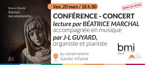 CONFÉRENCE-CONCERT BÉATRICE MARCHAL 20/03/2026 | 18 h 30 Dans le cadre du Printemps des poètes, la BMI d’Épinal en partenariat avec le Conservatoire Gautier-d’Épinal accueille Béatrice Marchal pour une conférence-concert autour de son livre Salomé, ma salamandre. Présentation et lecture d’un choix de textes accompagnée au piano par Jean-Luc Guyard. ▸ Conservatoire Gautier-d’Épinal, 22 rue Thiers, 88000 Épinal |